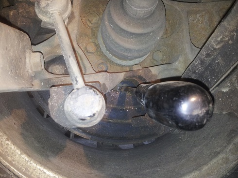 В підлокотнику, не знайшов нічого, розбирання підлокотника відклав. Поліз під машину. Там не знайшов нічого схожого на "деталі підтяжки", книжки немає. Згадав, що при заміні задніх колодок виявив, що там система така як у Сонати, на ручнік стоять "автономні" колодки всередині гальмівного диска. Поліз знову під машину,і рівно під шрусом знайшов овальну гумову пробочку. За нею, схожа на шестерню гайка, яка розводить гальмівні колодки ручника.