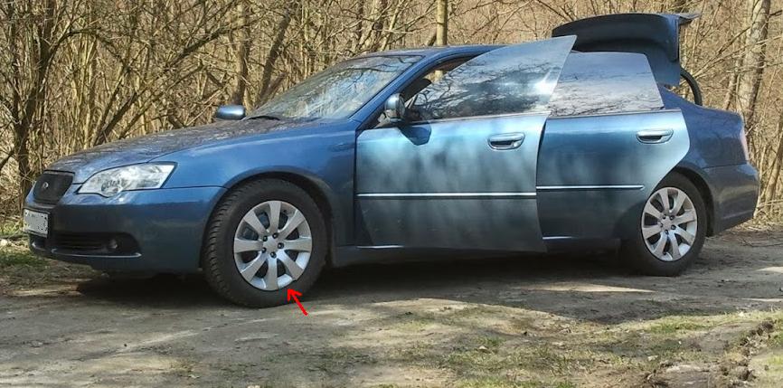 на другому фото на передньому колесі вже новий диск а стрілкою відмічено місце де коцнутий ковпак