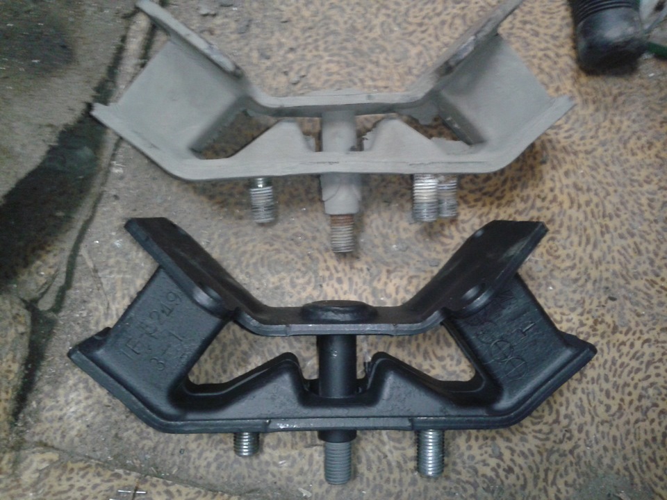 На ebay нашел только 41022AE12B - с двумя крепежными шпильками (+центральная). Старая была немного меньше по высоте, как бы слегка сдавлена (но не так сильно, как на фото, фото не мое), жестче, но вобщем в неплохом состоянии визуально. Поставил таки эту новую, хотя она мне не сильно понравилась, заодно вычистил кучу засохшего болота между днищем, теплозащитным щитком, выхлопом, в резинке подвесного и т.д. Предварительно вымыл и саму коробку, поскольку тоже была покрыта слоем засохшего болота. Нигде следов ненужного касания выхлопа коробки и т.п. к кузову больше не обнаружил.