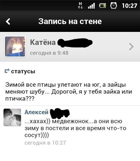 Еду как- то в полном автобусе) рядом стоит высокий симпатичный парень лет 19-ти... Вдруг у него зазвонил телефон) поднимает трубку (лучше бы он этого не делал!) и говорит: "здарово, я еду в автобусе, у меня накрылся телефон, поэтому включил громкую связь. Если что-то срочное- говори. Только, пожалуйста, без матов и потише)" И тут из динамиков на весь салон раздается мужской голос: "кхм... Всем привет! Меня зовут Макс, а это мой друг- Леха! Ему уже полгода не дает девушка, потому то он долбоеб!"))) весь автобус просто лежал в угаре!) парень чуть не умер со стыда)