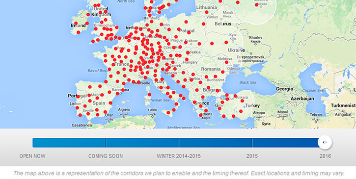 На сайте компании опубликована карта сети, на которой видно, что в 2016 году Tesla Motors планирует оборудовать две заправки в Киевской и Львовской областях. Впрочем, компания отмечает, что точное расположение и дата запуска электрозаправок могут измениться.
